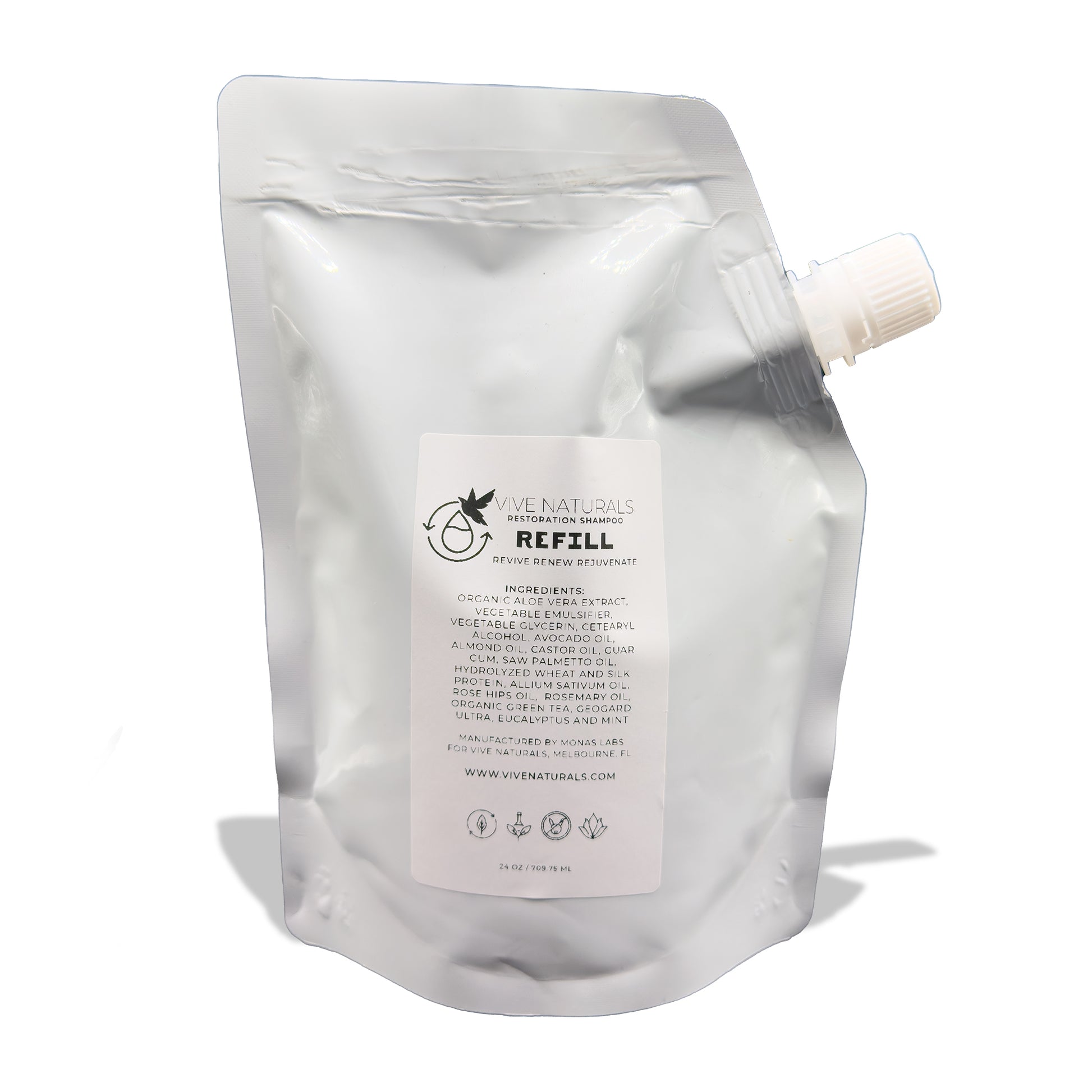 Our Restoration Shampoo Refill Pouch offers the same powerful, plant-based formula you know and love—now in a convenient, eco-friendly 24oz pouch that saves you money and reduces waste. Designed for easy, mess-free refilling, this pouch pairs perfectly with your Vive Naturals reusable shampoo bottles.
